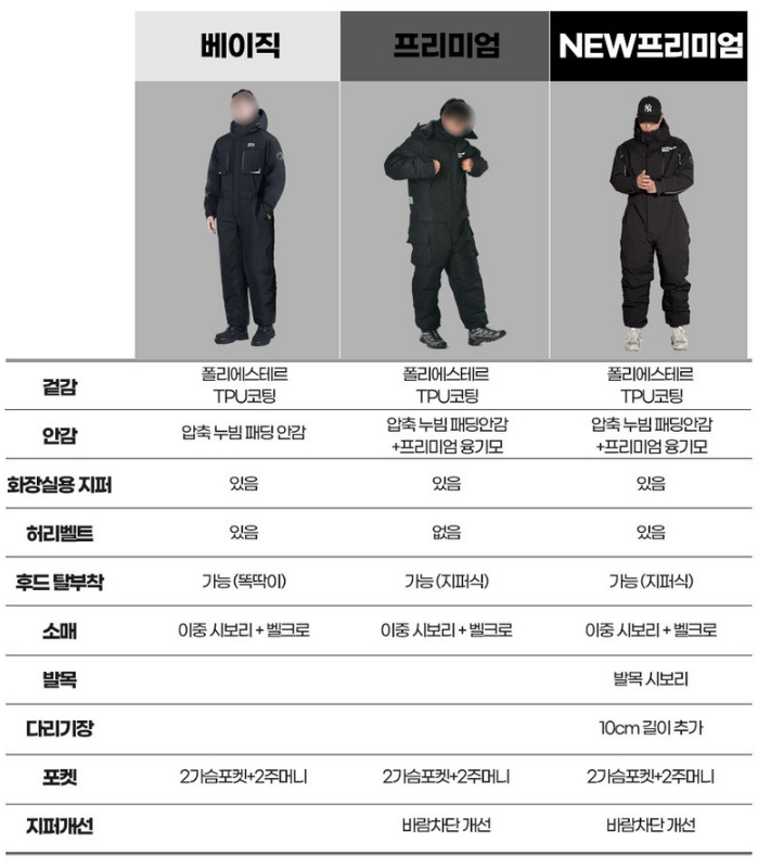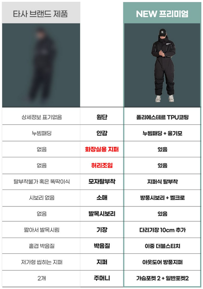 방수/방풍 기능탁월한 방수/방풍 기능. 눈, 비에도 끄떡없음.방풍/방한에 중점. 방수 기능 강화 (방수방한복으로 명시).
