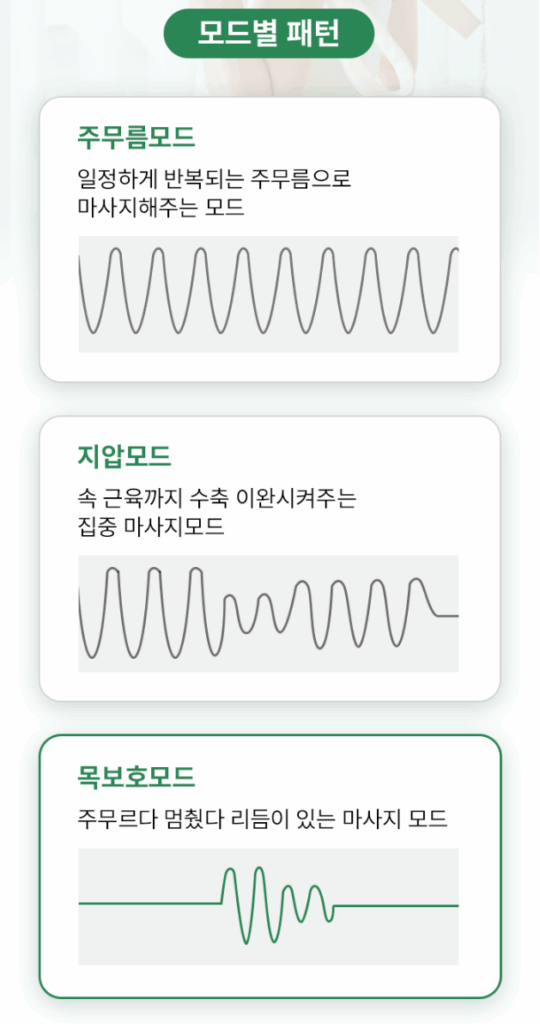 모드나 프로그램등 부가 기능을 선호하는 분: 바디릿 승모근 마사지기는 온열 기능과 3단계 강도 조절에 중점을 둡니다. 다양한 마사지 모드(예: 주무르기, 지압, 두드리기 등), 타이머, 앱 연동 기능 등 부가 기능이 많고 복잡한 제품을 선호한다면, 다른 고가형 마사지기를 고려하는 것이 좋습니다.