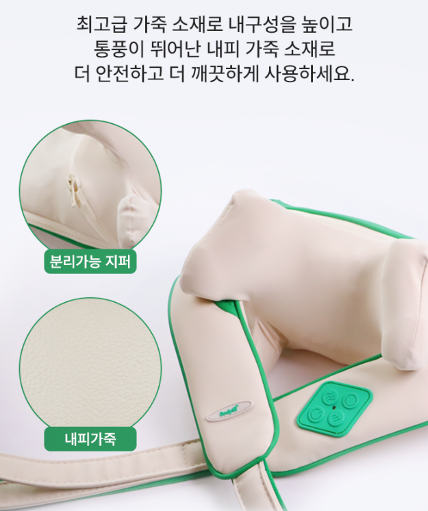 바디릿 승모근 마사지기는 몸의 굴곡에 잘 밀착될 수 있도록 인체공학적으로 디자인되었습니다. 마사지 헤드가 닿는 부분은 부드러운 고급 메쉬 패브릭 소재로 마감되어 피부에 닿는 촉감이 좋고 통기성이 우수합니다. 이는 장시간 마사지에도 땀이 차지 않고 쾌적하게 사용할 수 있도록 도와줍니다. 또한, 마사지기 본체의 외피는 내구성이 강한 PU 가죽 또는 고밀도 패브릭 소재로 제작되어 오래도록 깔끔하게 사용할 수 있습니다.