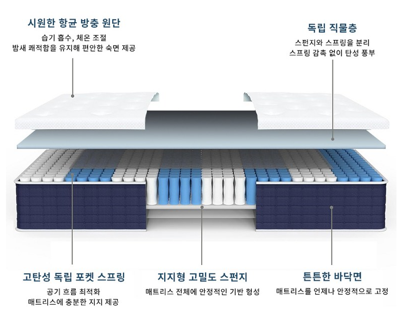 - 옆 사람 뒤척임에도 꿀잠! 흔들림 없는 숙면 환경이에요! 독립 스프링의 가장 큰 장점 중 하나는 **’흔들림 방지’**예요. 옆 사람이 뒤척이거나 침대에서 일어나도 그 진동이 매트리스 전체로 전달되지 않아 방해받지 않고 숙면을 취할 수 있답니다. 큐니로님이 예민한 잠자리 때문에 고민이 많으셨다면, 이 매트리스가 진정한 숙면을 선물해 줄 거예요!