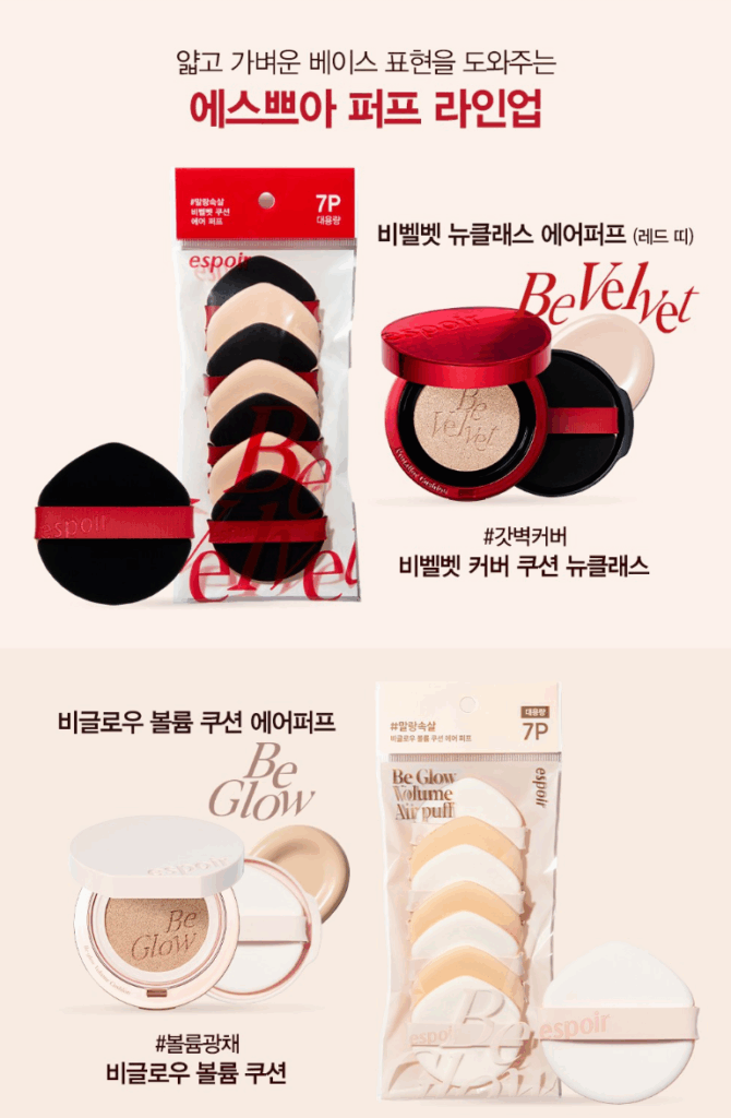 쿠션과의 완벽한 시너지: 에스쁘아 비글로우 쿠션과 함께 사용하면 마치 원래 하나였던 것처럼 최상의 피부 표현을 경험할 수 있습니다. 퍼프가 쿠션의 촉촉한 제형을 그대로 살려 피부에 건강한 윤기와 볼륨감을 더해준답니다.- 파운데이션