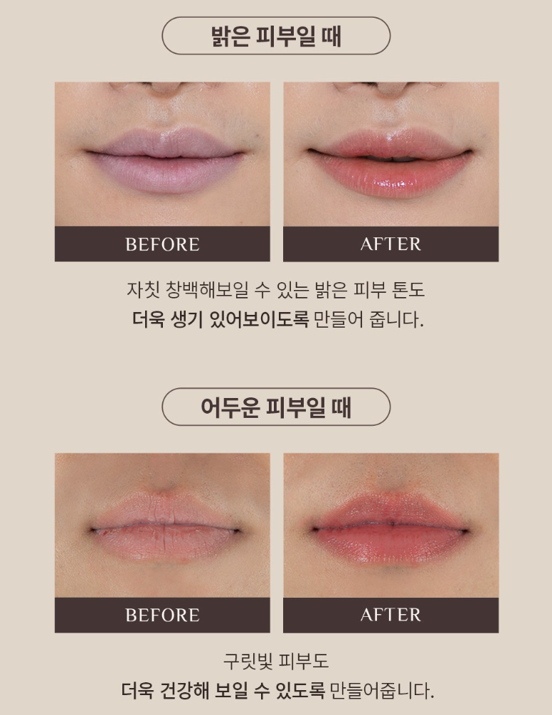 보습 & 사용감부드러운 발림성, 끈적임 없는 촉촉함. 블루베리 향으로 쾌적한 사용감. 촉촉하고 윤기 있는 마무리감. 약간의 끈적임 있을 수 있음.매우 촉촉하고 편안한 오일 틴트 제형. 부드러움.