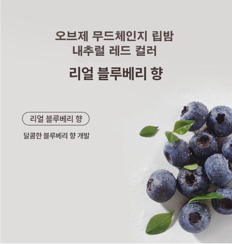 오브제 무드체인지 립밤은 블루베리 향을 담은 내추럴 레드 컬러 립밤이에요.  단순히 향만 내는 것이 아니라, 입술을 촉촉하게 가꿔주는 보습 성분들이 함유되어 있답니다. 외부 자극으로부터 연약한 입술을 보호해주고, 건조함을 예방해주는 데 도움을 줘요. 자극 없이 순한 성분들로 민감한 입술에도 편안하게 사용할 수 있도록 설계되었어요. 자연에서 온 듯한 편안함으로 여러분의 입술을 부드럽게 감싸줄 거예요.